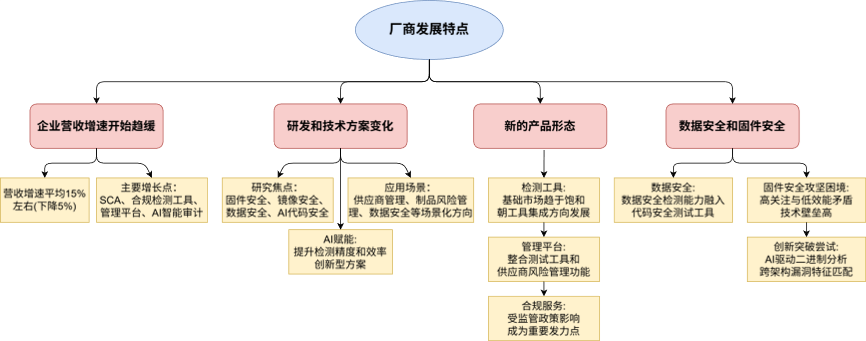 (一)厂商研发重心和技术方案的变化。随着传统代码安全测试技术的成熟,基础型工具市场竞争开始白炽化。厂商安全研究焦点逐渐从传统代码审计、软件加固技术向固件安全、镜像安全、数据安全、AI代码安全等新型数字制品类型领域扩展。应用场景方面,也在从传统开发安全向供应商管理、制品风险管理、数据安全等场景化方向转变,这对厂商工具融合和平台化能力也提出一些更高要求。