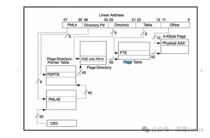 x86_64架构下Linux用了四级页表来表示一个映射关系,依次为PGD、PUD、PMD、PT。每级页表4K大小,内部元素大小为8字节,高位指向了下一级页表的物理地址,低位表示页表属性(是否存在、读写权限、是否脏等等)。顶层页表PGD的物理地址存放在CPU的CR3寄存器中,供MMU访问。48位线性地址也相应地分成了五段:前四段,每段长9位,用来索引对应页表的元素;最后一段长12位,用来在页面中索引物理地址。