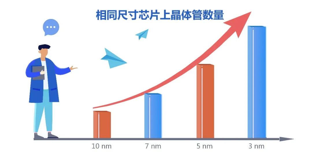 我们经常听说,5 nm芯片、3 nm芯片,这里的5 nm是指芯片的制程工艺,也就是芯片内部晶体管之间的距离。