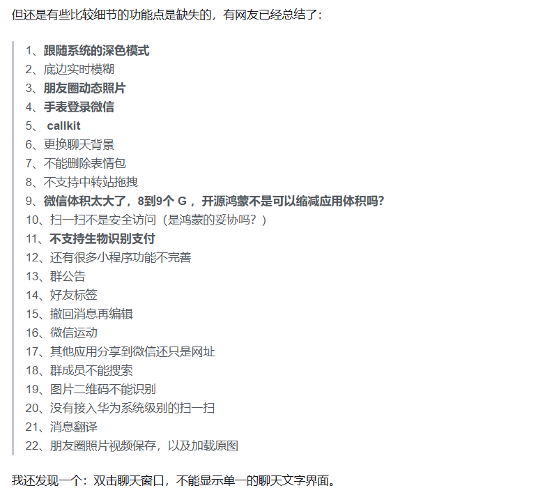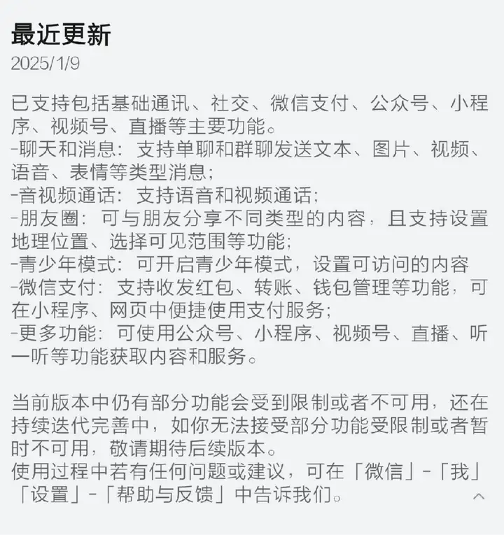目前,基础通讯、社交、微信支付(以及大家特别关注的能否在春节期间领上红包)、公众号、小程序、视频号、直播等功能已经配齐,绝大多数的使用场景是cover上了!
