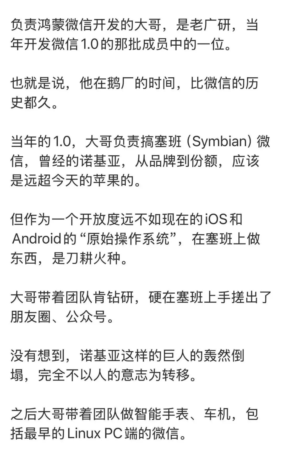 鹅厂调了内部资历比微信诞生年份还老的骨干组建了新团队。从头开始手搓,一边手搓一边和鸿蒙团队协调遇到的问题。腾讯官方说,“这个团队在内部素以擅长攻克不同环境、不同语言的开发工作著称。”