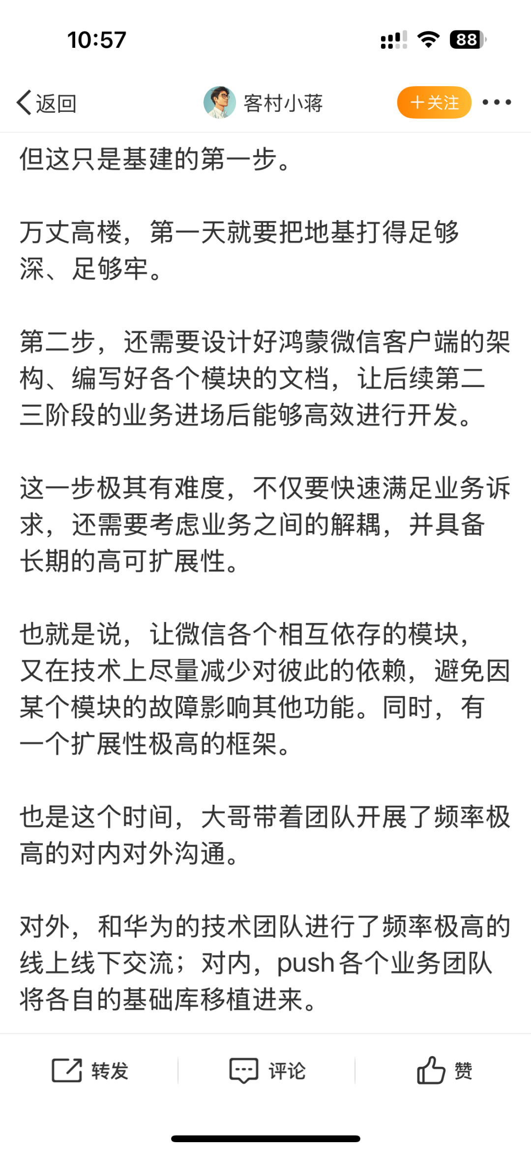 客村小蒋还详述了一个2024年10月29日的插曲,“某种程度上,可以反映微信鸿蒙版开发团队的工作情形和协作流程。”