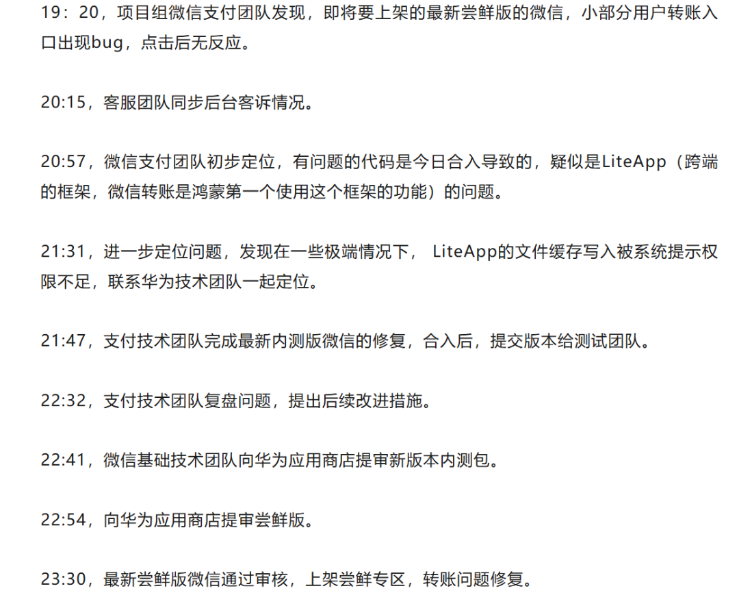 鸿蒙遇上微信,这样的问题就会加倍,两个高速前进、互相影响的复杂系统,让修bug就像一场修行。”
