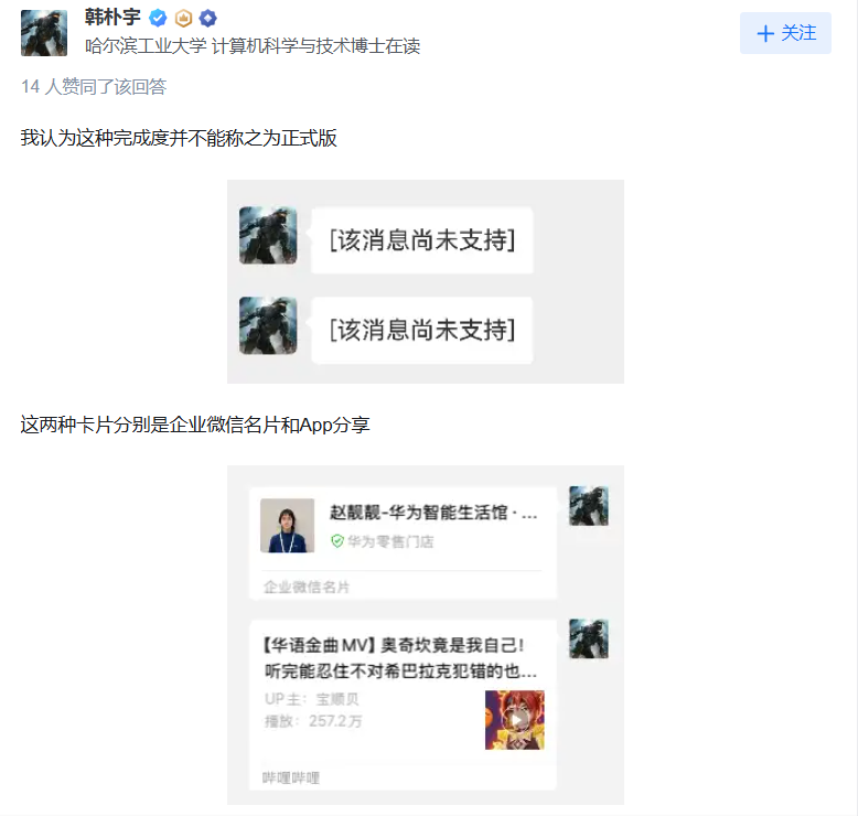 一位知乎用户因为卡片分享的问题,而直言“不能称之为正式版”。