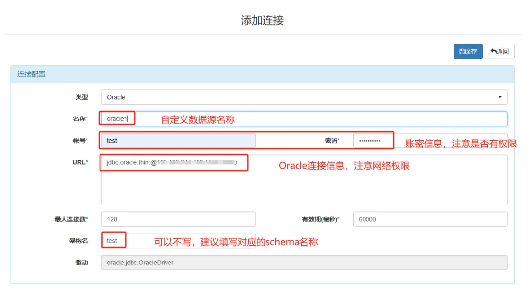 配置一个名为oracle1的数据源,对应填写连接信息、账号密码等,完成后保存即可