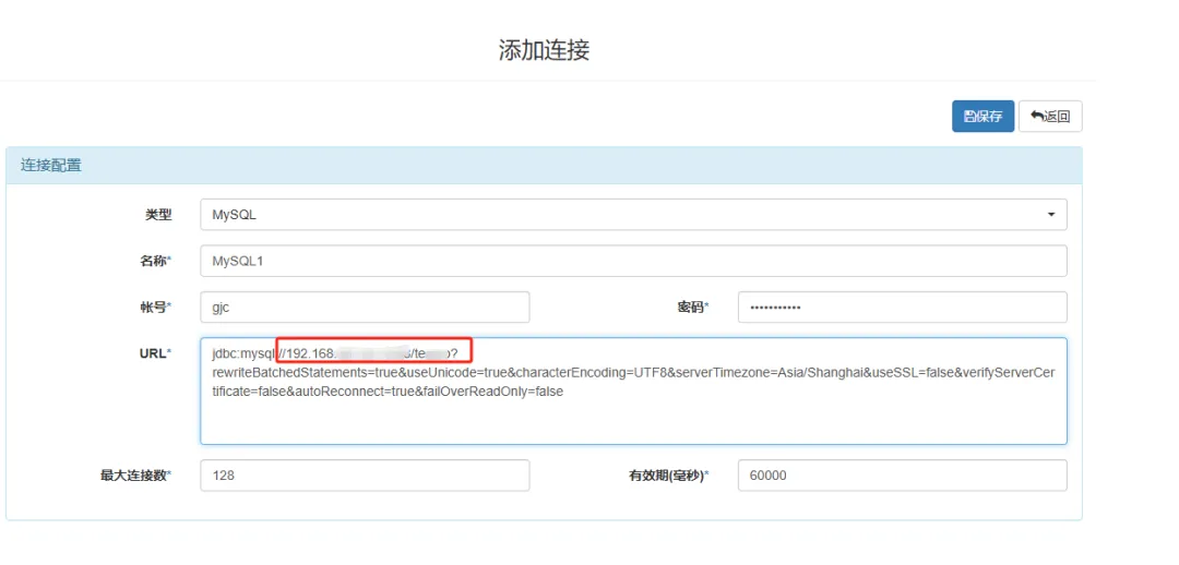 再配置一个MySQL数据源作为目标库,MySQL的连接URL里要注意库名的配置。