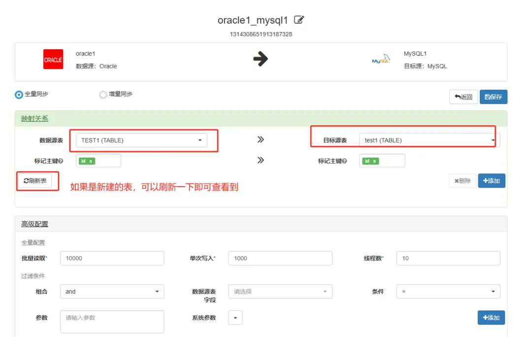保存后进行相关表影射等配置,例如选择表名及目标表,对应的主键名等。