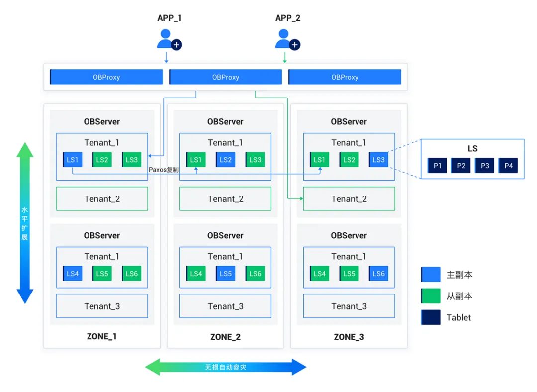 1.1 原生分布式和分区表特性OceanBase 的原生分布式架构分为 OBProxy 层, OBServer 层,前者负责数据路由转发,后者负责数据存储与计算。OceanBase 通过可用区(Zone)来划分节点,以便集群内的自动容灾处理和优化策略能更好地工作,根据不同的场景部署不同高可用方案,如:同城三机房三副本部署,三地五中心五副本部署等,同时,通过增加节点实现透明水平扩展,支持业务快速的扩容和缩容,解除我们的单机容量限制。