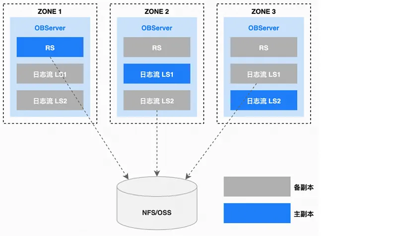 OCP 工具的另一项重要功能是备份与恢复。在 OCP 中,物理备份由基线数据、日志归档数据两种数据组成,数据备份优先选择 Follower 副本进行备份,当用户发起数据备份请求时,该请求会首先被转发到 RS 所在的节点上,RS 会根据当前的租户和租户包含的 PG 生成备份数据的任务,然后把备份任务分发到 OBServer 节点上并行地执行备份任务,把备份文件数据存放在指定的网络存储,如NFS、S3等。