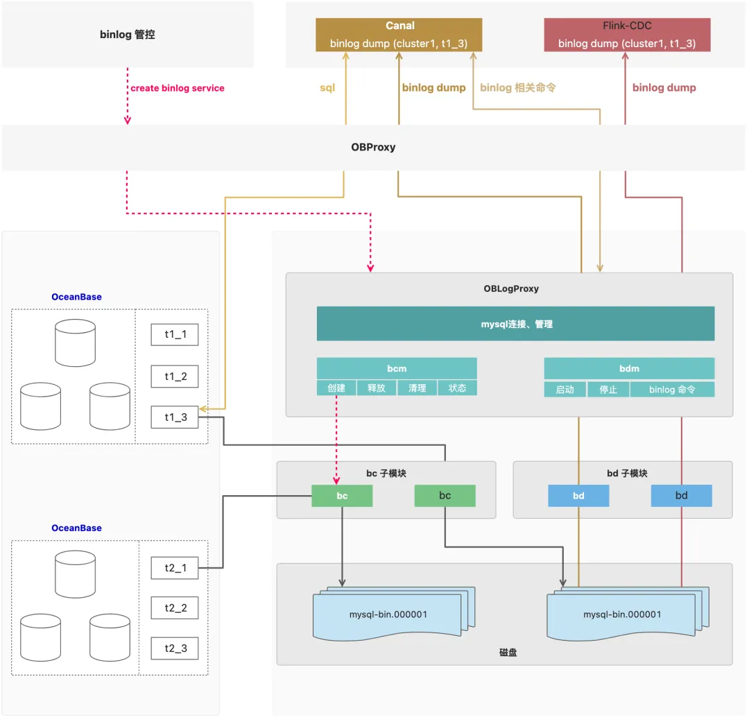 oblogproxy(OceanBase LogProxy,即 OceanBase 日志代理)是 OceanBase 的增量日志代理,它可以与 OceanBase 数据库建立连接并进行增量日志读取,为下游服务提供变更数据捕获(CDC)的能力。其 Binlog 模式为兼容 MySQL binlog 而诞生,支持现有的 MySQL binlog 生态工具来同步 OceanBase,现有的 MySQL binlog 生态工具可以平滑切换至 OceanBase 数据库。