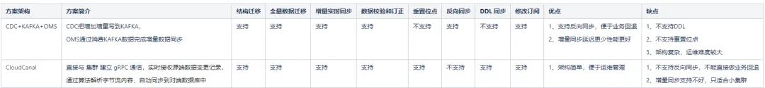 云服务存储了海量数据并且数据还在持续快速增长,原本 MySQL 分库分表方案的维护与管理需要巨大成本,而且存在较大的可用性风险。OceanBase 分区表替代了分库分表方案,不仅解除了维护管理成本,高压缩特性也节省了存储成本。风控集群数据写入量较大,导致主从延迟一直居高不下,存在数据丢失风险,OceanBase 数据强一致性很好的解决这个问题并且存储空间节省70%。金服归档库使用 tukodb 存储,存在唯一索引失效的问题,tukodb 官方也不再维护,可用性得不到保证,迁移 OceanBase 后,该问题迎刃而解,查询与 DDL 性能有大幅度的提升,分布式水平扩展解决单机容量问题。3.2 某分布式数据库迁移 OceanBase 实践由于此前在一些边缘业务应用某分布式数据库,自 OceanBase 上线后,我们也决定将这部分业务统一迁移到 OceanBase。我们考虑了两种迁移方案,第一种方案是基于某分布式数据库的增量同步工具和 KAFKA+OMS,第二种方案是基于 CloudCanal,并进行了方案对比,如下: