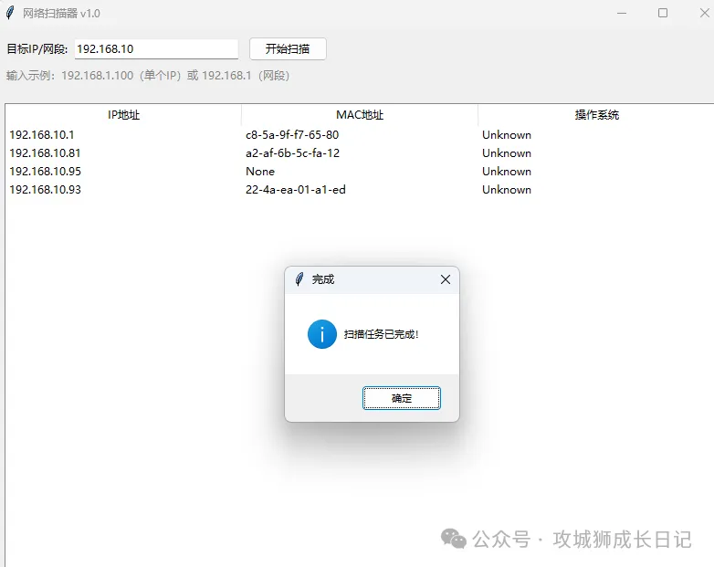 通过本项目,我们成功地创建了一个基于Python的网络扫描器,具备扫描单个IP、IP网段、获取MAC地址、操作系统信息等功能。利用Tkinter打造了简洁的GUI界面,借助多线程技术提高了扫描效率,进度条的加入则大大改善了用户体验。