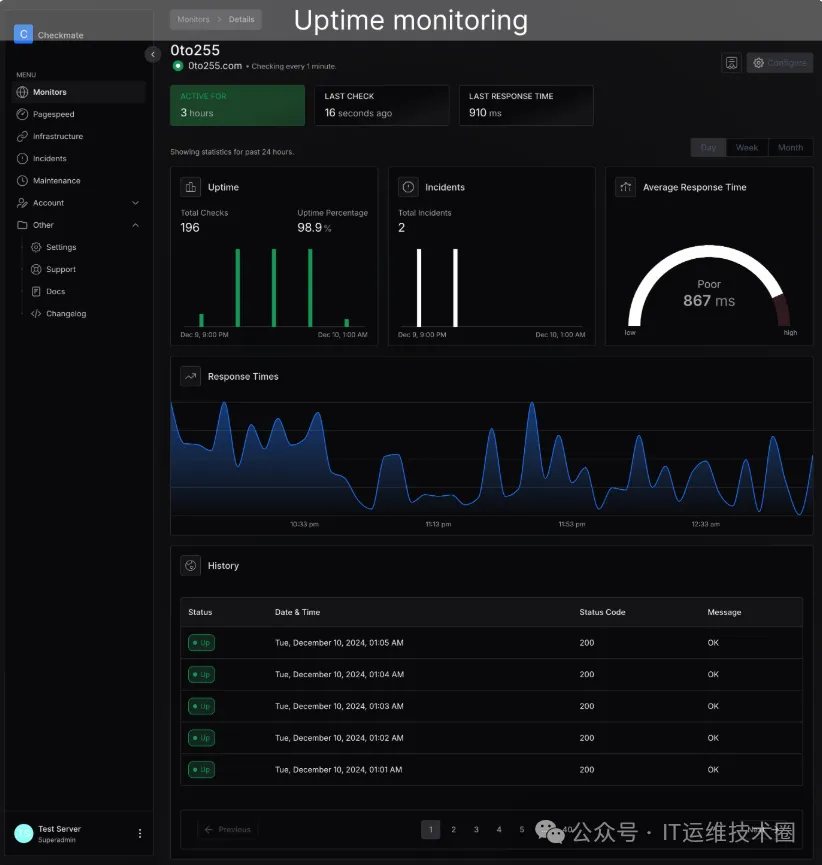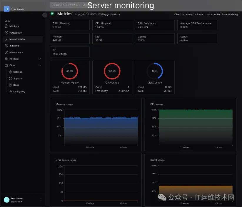 Checkmate 是由 BlueWave Labs 开发的开源、自托管的服务器和基础设施监控工具,旨在实时跟踪服务器硬件状态、正常运行时间、响应时间以及事件,并以美观的可视化方式呈现。