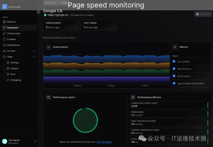 登录 Checkmate 仪表板,选择添加新的监控项。根据需要,选择监控类型(如 HTTP 监控、Ping 监控或 PageSpeed 监控)。填写相关信息,如 URL 或 IP 地址、监控间隔时间等。保存后,Checkmate 将开始监控,并在仪表板中显示实时数据。(3) 查看报告和事件: