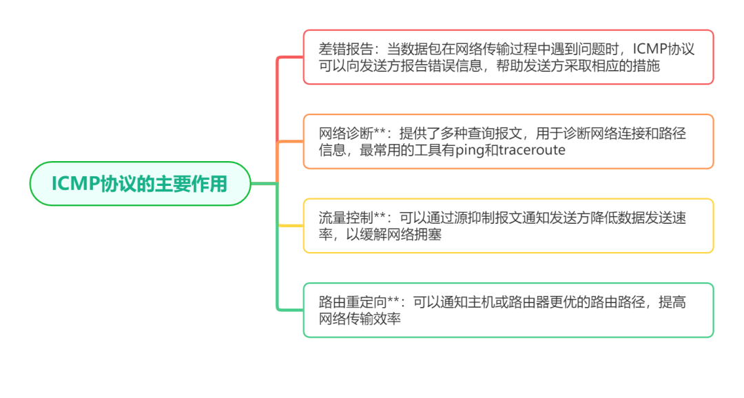 因为IP协议本身并不提供可靠的传输机制,也不具备差错报告和控制功能。所以当数据包在网络传输过程中出现问题时,IP协议无法及时通知发送方。为了解决这个问题,ICMP协议应运而生。ICMP协议的主要作用包括: