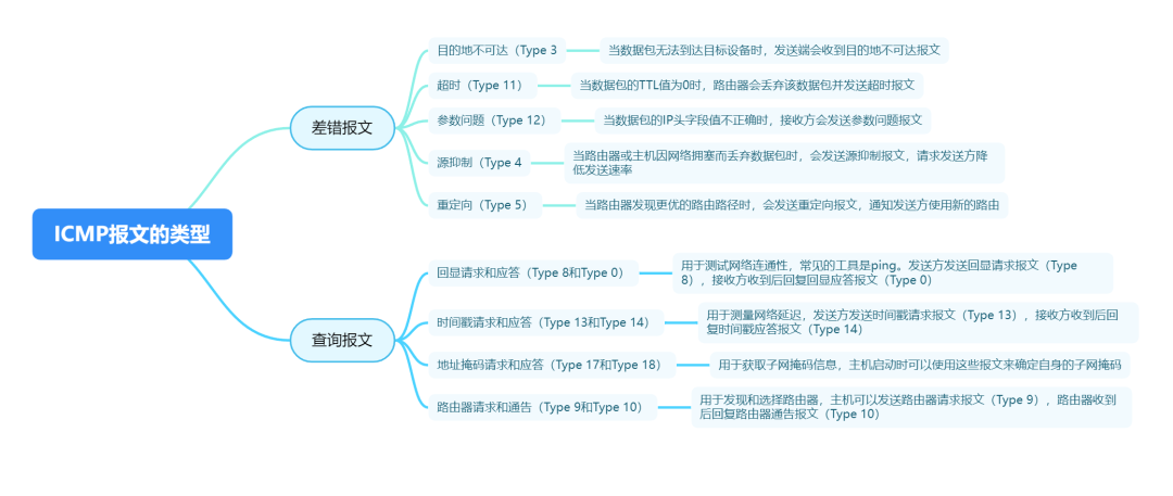 网络诊断:提供了多种查询报文,用于诊断网络连接和路径信息,最常用的工具有ping和traceroute。