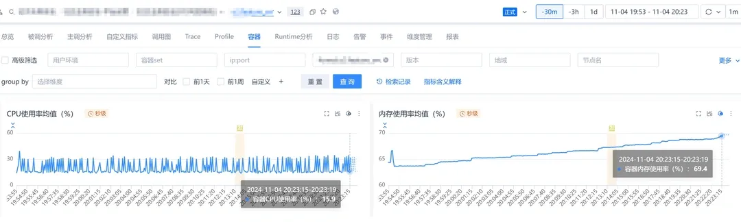 请求量过大,服务处理不过来,造成协程积压,或者资源积压;协程泄露,由于未正确关闭、或者协程阻塞等原因,导致协程积压。123平台容器监控如下: