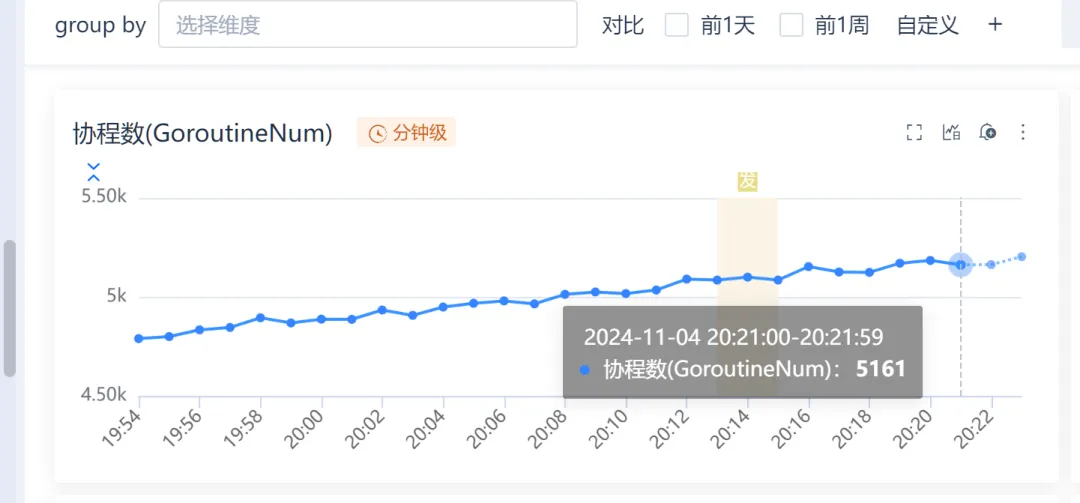 1. 检查请求量级第一时间排查了一下服务的请求量和CPU/内存情况,发现请求量并未上涨,内存上涨的同时,CPU并未线性相关上涨,但是协程数一直在上涨;这里就排除了请求积压这个原因。