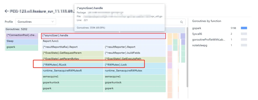 发现协程大量积压在gopark函数等待上,证明大量协程正挂起等待,根据调用栈定位到业务代码分别是对一个读写锁的读锁、写锁加锁行为: