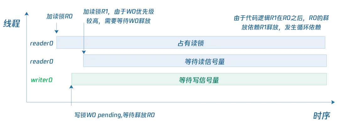 reader0:加锁R0成功writer0: 加写锁W0申请,标记已经有writer等待写锁,然后等待R0释放,W0->R0reader0: 尝试加锁R1,发现已经有writer在等待,因为写锁优先级较高,所以需要等待W0释放,R1->W0reader0: 由于代码逻辑上R0,R1是先后关系,所以R0需要依赖R1释放,R0->R1这样就造成了死锁必要的循环依赖条件:R0->R1->W0->R0