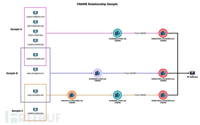 FBI同期发布紧急警报,披露与Funnull Technology Inc.相关的入侵指标(IOCs)。警报指出:"2025年1月以来,FBI已识别548个与超过33.2万个独特域名关联的Funnull规范名称(CNAME)。2025年4月分析的8个域名样本显示,其解析指向4个与Funnull基础设施关联的CNAME。"