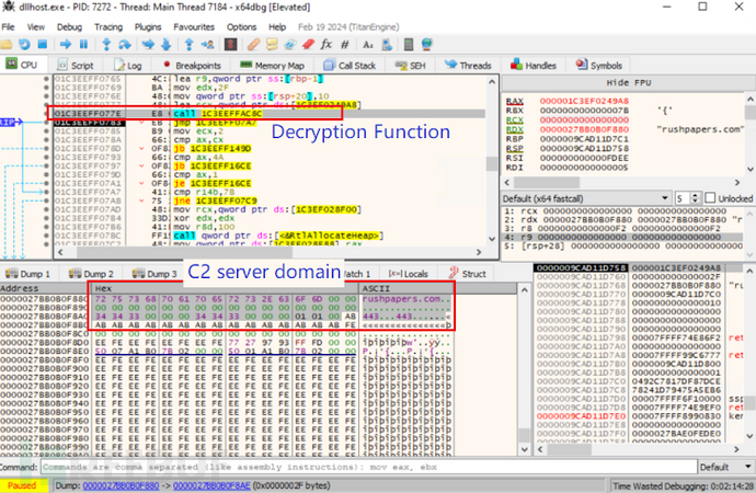 研究显示,该恶意程序执行后会解密内存中存储的命令控制(C2)域名信息,随后与新发现的威胁域名"rushpapers[.]com"建立连接。研究人员指出:"主线程启动通信线程后即进入休眠状态,直至通信线程完成执行,所有C2通信均通过TLS协议加密传输。"