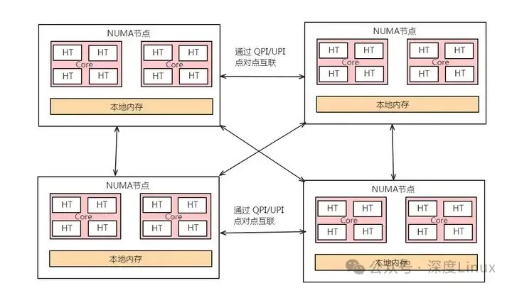 正因如此,诸多企业级应用,像大型数据库管理系统、科学计算软件等,纷纷精心优化内存分配策略,竭力让数据尽可能靠近使用它的处理器,以充分挖掘 NUMA 架构的性能潜力,确保系统高效运转。每个节点都有自己的内存(称为本地内存),并可包含一个或多个处理器。节点和节点之间通过 QPI(Intel QuickPath Interconnect)完成互联,其架构如下图所示: