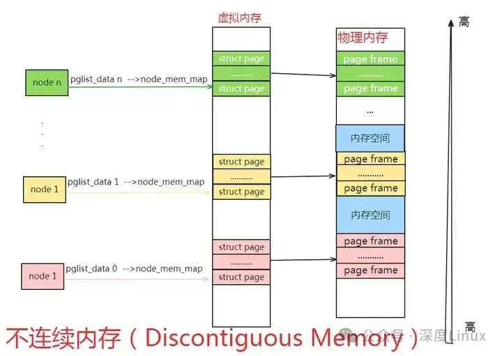 为了解决这个问题,引入了非连续内存模型。在非连续内存模型下,系统将每个节点的内存看做是一段单独的地址连续的平坦内存,然后在每个节点对应的pglist_data 结构体实例的 node_mem_map 字段中,保存着该节点对应的 struct page 数组的基地址。这样,就将一段不连续的内存空间分割成了多个连续的内存区间,每段区间都对应着平坦内存模型。