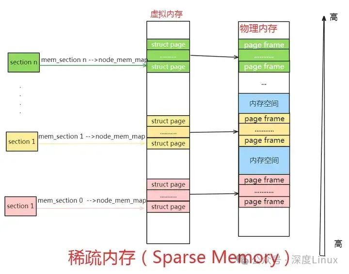 随着内存热插拔技术的出现,不止节点间内存地址不连续,单个节点内的内存地址不连续也成了常态。这时候,再用非连续内存模型就不合适了,于是又引入了稀疏内存模型 SPARSEMEM。稀疏内存模型是 Linux 中最通用的内存模型,其实不管是平坦内存模型还是非连续内存模型,都可以看做是稀疏内存模型的一种特殊状态。