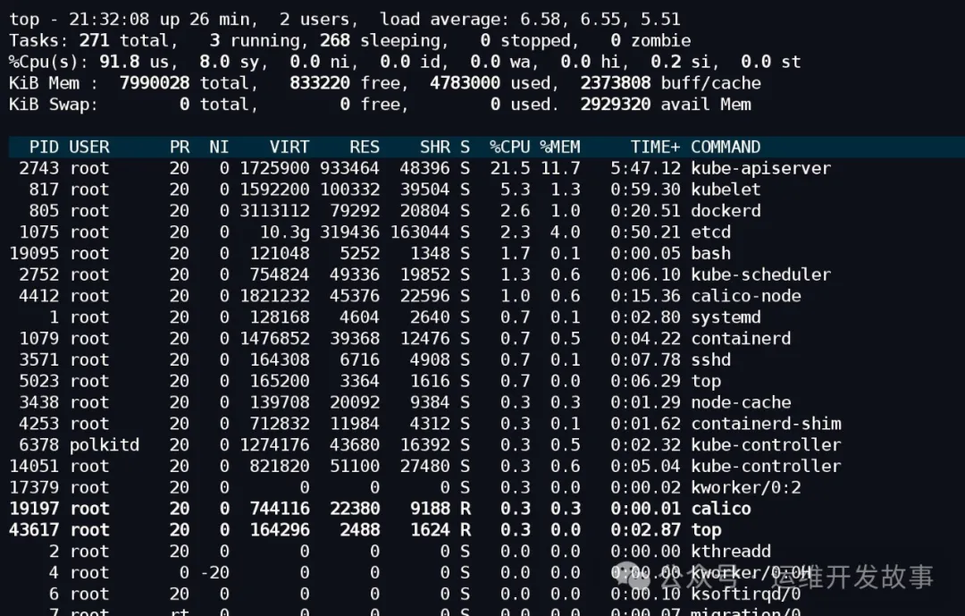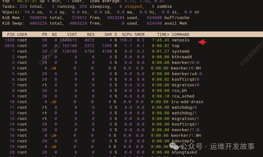 随即叫他看看能不能找到CPU使用率高的进程,但他使用top命令,未发现异常进程。