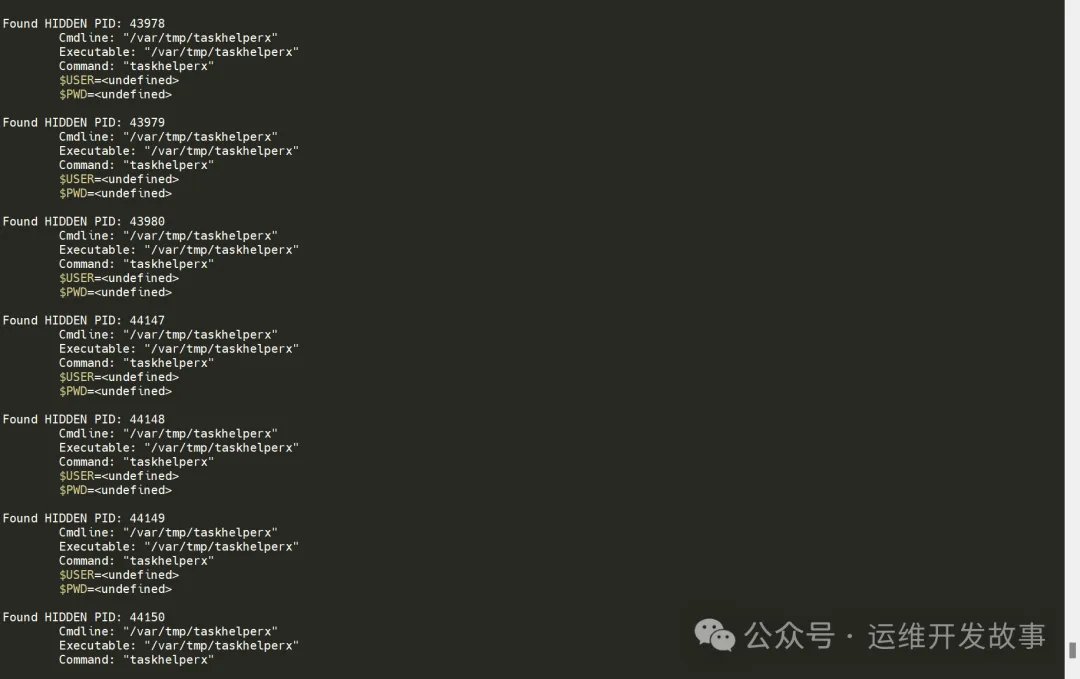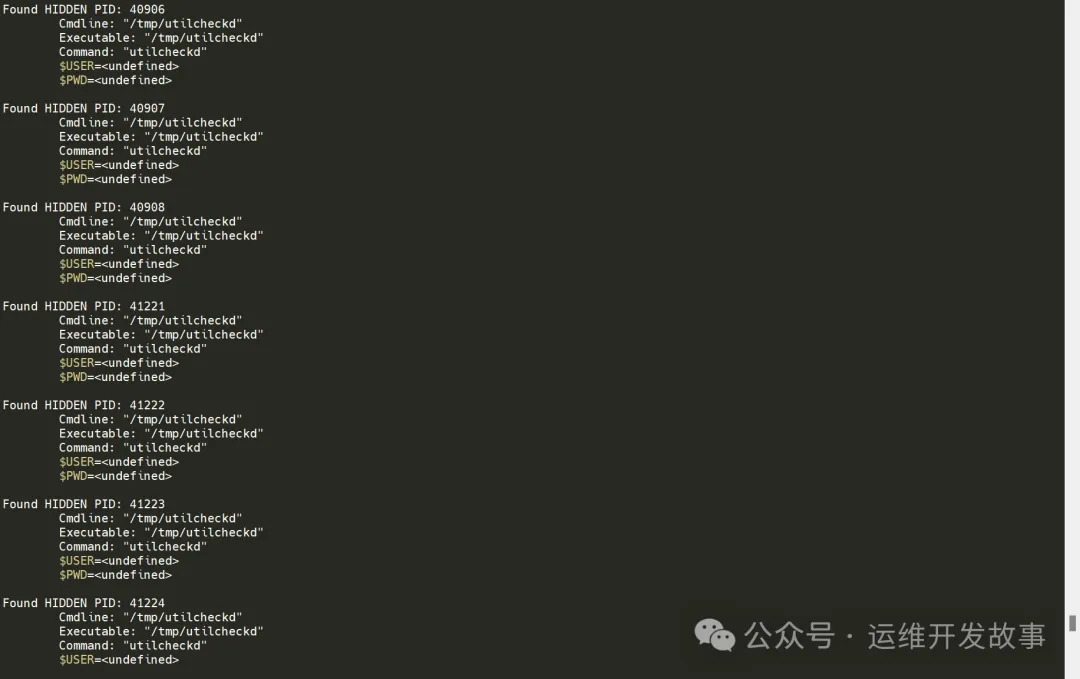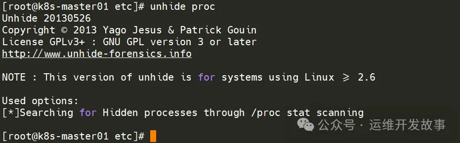 除此之外,还可以使用unhide命令来查看隐藏进程。使用yum install unhide安装命令,然后使用unhide proc即可发现隐藏进程。