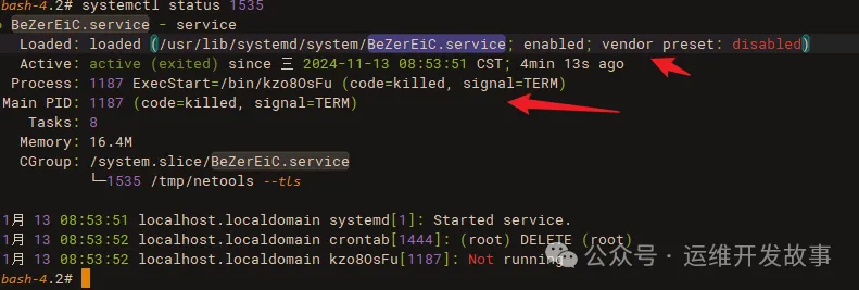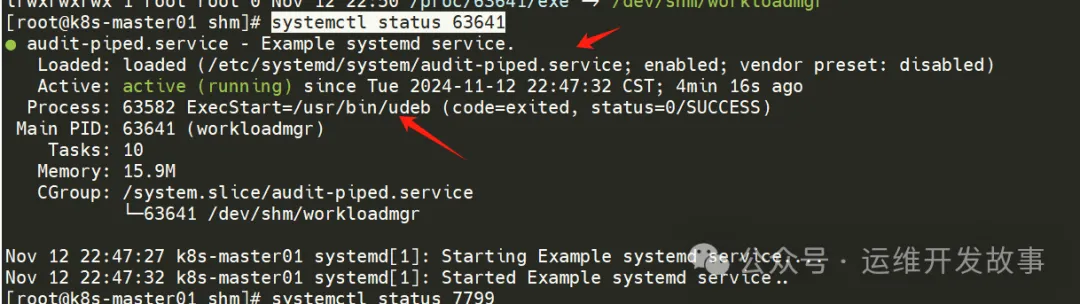 通过图中的箭头所指来看,就不是正常的服务。查看启动的二进制文件,发现也是才安装不久。