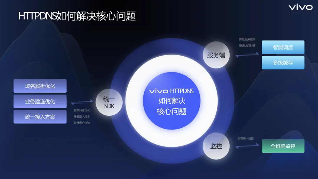 一是 HTTPDNS 作为备用 DNS 的情况下无法解决域名误封禁的问题;二是各业务没有统一的接入方案,接入的成本比较高;三是客户端的网络框架不统一,业务适配比较困难;四是行业商业化 HTTPDNS 的成本比较高,业务无法大范围使用;五是缺乏统一的用户全链路监控,无法实时监控端侧 DNS 解析情况。为了解决以上落地过程中的难题,我们需要建设 vivo HTTPDNS 端到端的一体化解决方案。1.2 HTTPDNS 如何解决核心问题建设一套 HTTPDNS 一体化解决方案,解决以上核心问题,助力业务的发展;我们主要从以下几个方面切入: