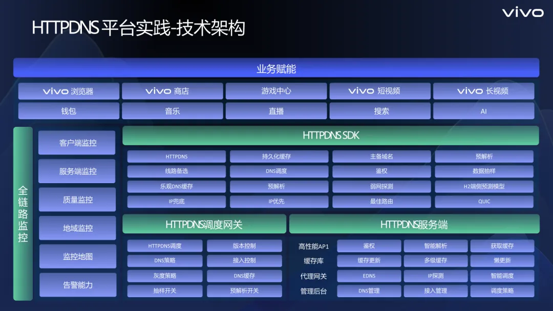 2.1 vivo HTTPDNS 技术架构vivo HTTPDNS 平台为业务提供一体化的 HTTPDNS 解决方案,整体架构主要包括四大模块;分别是 HTTPDNS SDK,HTTPDNS 服务端、统一调度网关和全链路监控。