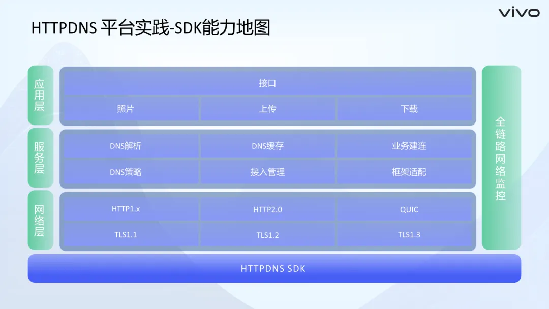 2.2 HTTPDNS SDK 优化SDK 为我们承载 HTTPDNS 一体化解决方案的核心能力;在架构上主要提供底层网络协议的支持,支持 HTTP1.X、HTTP2.0 和 QUIC 传输协议,同时也支持 TLS1.1、TLS1.2 和 TLS1.3 等加密协议;同时,在 TLS 协议的基础上支持 Session Ticket 等优化策略;服务层提供 DNS 解析、DNS 缓存、业务建连、DNS 策略管控等功能;应用层提供接口、下载、上传等能力;同时也提供全链路的网络监控。