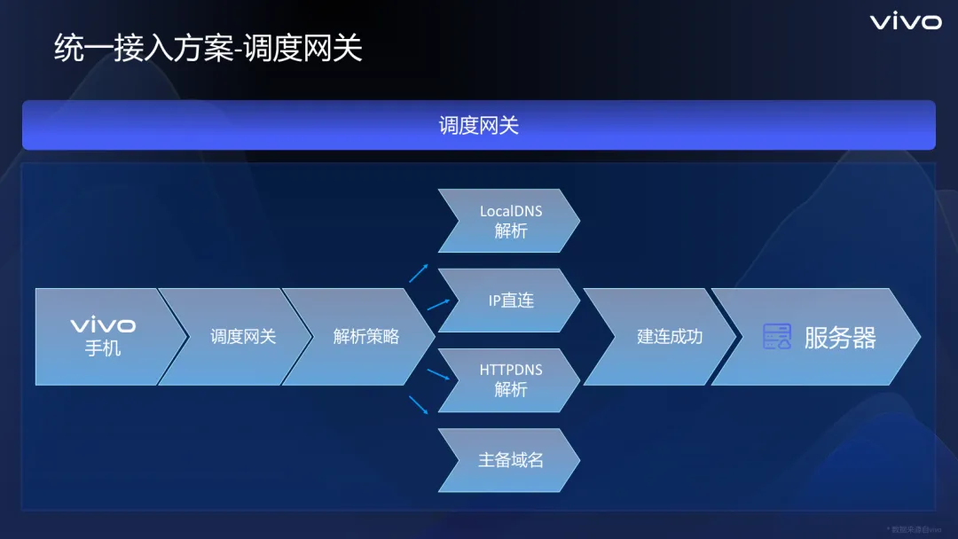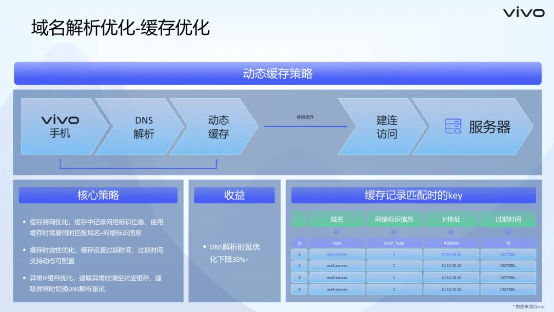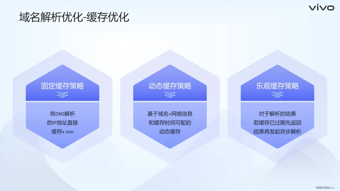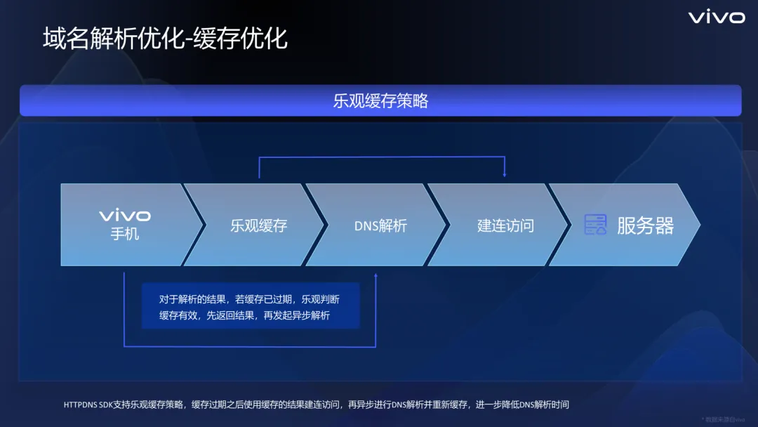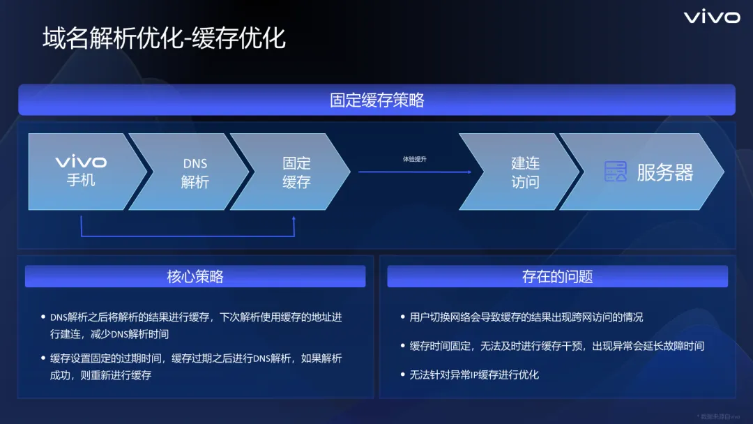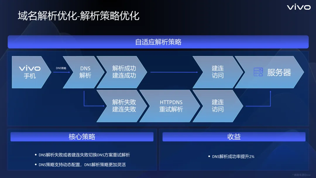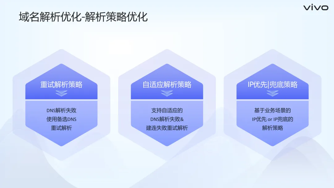 一是域名解析优化,通过解析策略优化和缓存优化,提升 DNS 解析成功率和降低 DNS 解析时延;二是业务建连优化,通过网络诊断、网速检测、长连接优化、最佳路由、QUIC 建连竞速,提升业务访问的成功率和降低业务访问时延,提升我们 vivo 手机用户的使用体验;三是统一接入方案,通过调度网关和多网络框架适配,降低业务接入的成本。2.2.1 域名解析优化