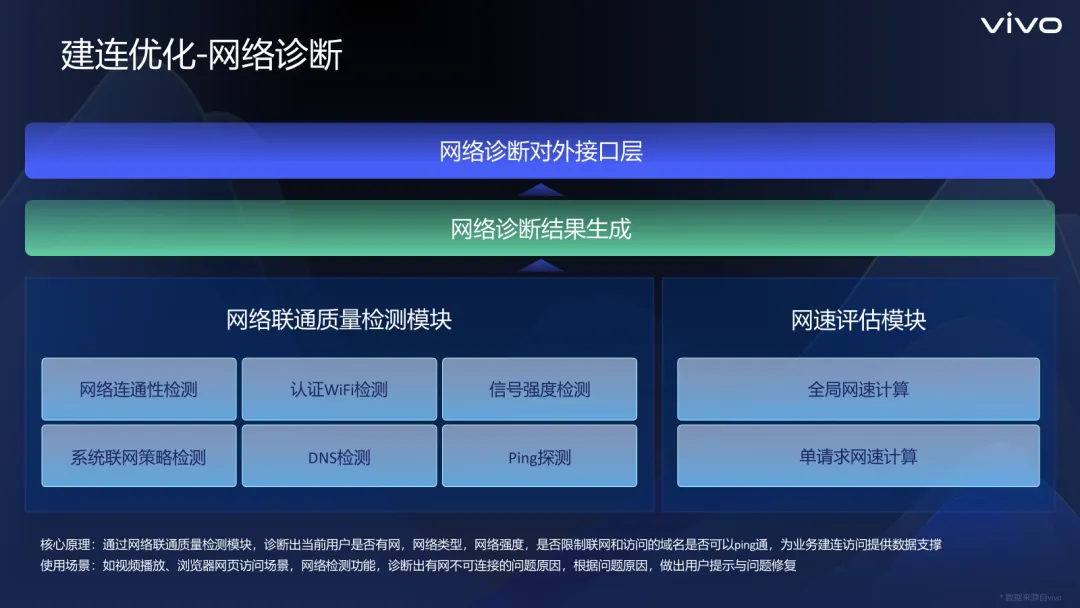 网络诊断主要使用的场景是为视频播放、浏览器网页访问提供网络检测功能;诊断出用户有网但是无法连接的问题原因;根据问题原因,做出用户提示与问题修复,提升 vivo 手机终端用户的使用体验。