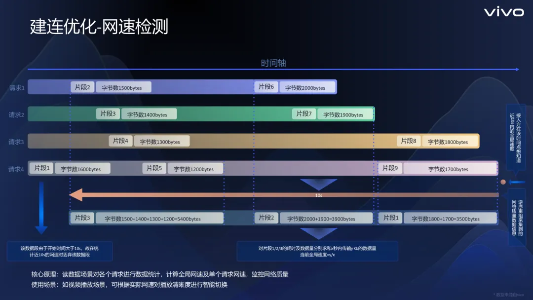 建连优化的第二能力是网速检测,其核心原理是读数据场景对各个请求进行数据统计,计算全局网速以及单个请求的网速,以达到监控网络质量的目的。例如接入方在该时间点想知道近x秒内的全局速度;则可以逆序重组采集到的网络质量数据信息,将此时间段内的多个请求的数据进行分段求和,算出在x秒内传输 y kb 的数据,用数据除以时间则为该时间段内用户的全局网络速度。