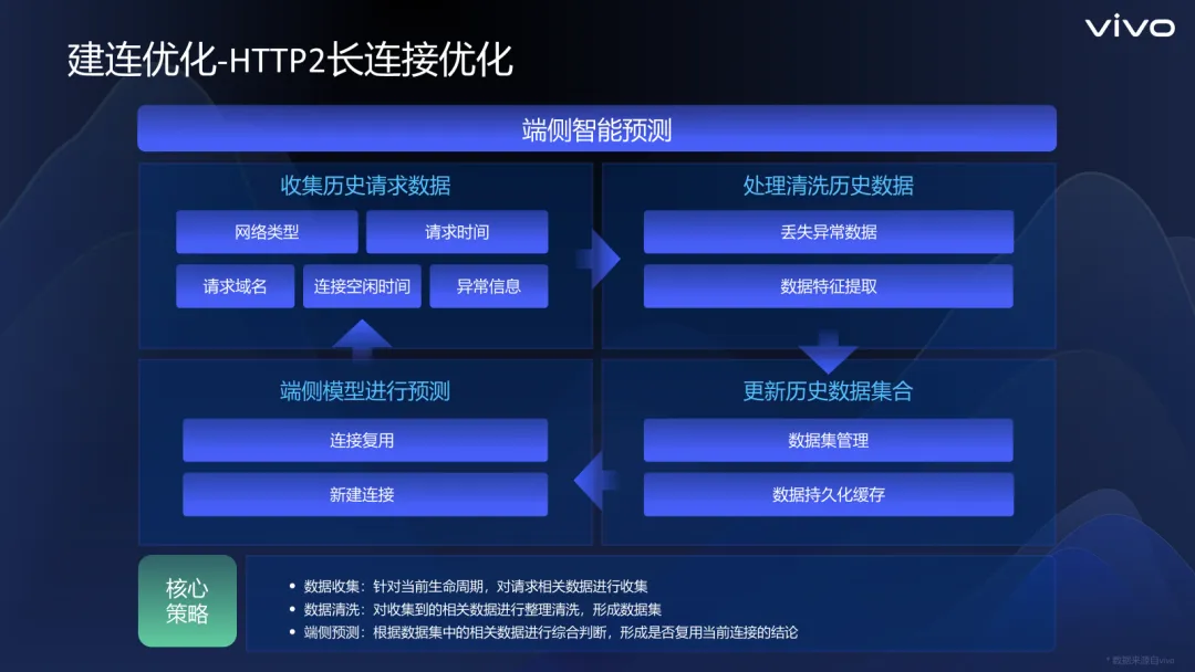 第一种是长连接复用的被动检测,当出现长连接超时的异常时,SDK 会强制从缓存池中移除此连接,这样业务重试时,SDK 就会新建连接,避免出现访问超时的异常。第二种优化策略是长连接复用的主动探测:在连接复用时,同步发起 ping 帧请求,并在2秒后去检查 ping 的结果,如果没有收到 ping 帧且当前连接上近2s内没有数据传输,则主动断开连接并在 sdk 内部进行重试;被动检测需要先产生一次超时异常才会命中相关策略,主动探测也需要先花费2秒进行检测。因此我们需要一种更加智能的方式来判断连接是否复用,以减少异常对业务的时延影响。第三种优化策略是端侧的智能预测,预测长连接不可用的时间,提前做出是否新建长连接的抉择。端侧智能预测的核心策略是针对当前生命周期,对用户请求的相关历史数据进行收集,包括网络类型、请求时间、请求域名、连接空闲时间和异常信息等;根据历史请求数据,不断缩小可能出现复用超时问题的数据区间;之后对收集到的数据进行清洗,丢失异常数据和进行数据特征提取,形成数据集;根据数据集中的相关数据进行综合判断,形成是否复用当前连接或者新建连接的结论。