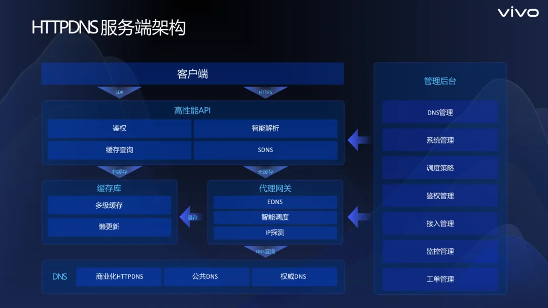 下面我们介绍 vivo HTTPDNS 服务端的架构,HTTPDNS 服务端主要提供高性能 API、缓存库、代理网关等能力;高性能API提供智能解析、鉴权、缓存查询等能力;缓存库提供多级缓存、懒更新等能力;代理网关提供 EDNS、智能调度、IP探测等能力。通过这些能力给 vivo 用户提供高可用,低时延的HTTPDNS 解析服务。同时,也提供 HTTPDNS 管理后台,支持 DNS 管理、系统管理、调度策略管理、鉴权管理、接入管理等能力。
