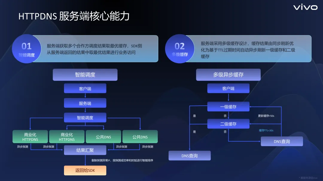 服务端最核心的能力主要分为智能调度和多级缓存,服务端智能调度是获取多个合作方的解析结果,通过异步IP探测等策略,取最优的结果进行缓存,SDK 从服务端获取最优的IP地址进行业务访问。多级缓存将缓存结果由同步刷新优化为基于 TTL 过期时间的自动异步刷新一级缓存和二级缓存,极大的提升服务端的性能,同时也降低了 HTTPDNS 的使用成本。