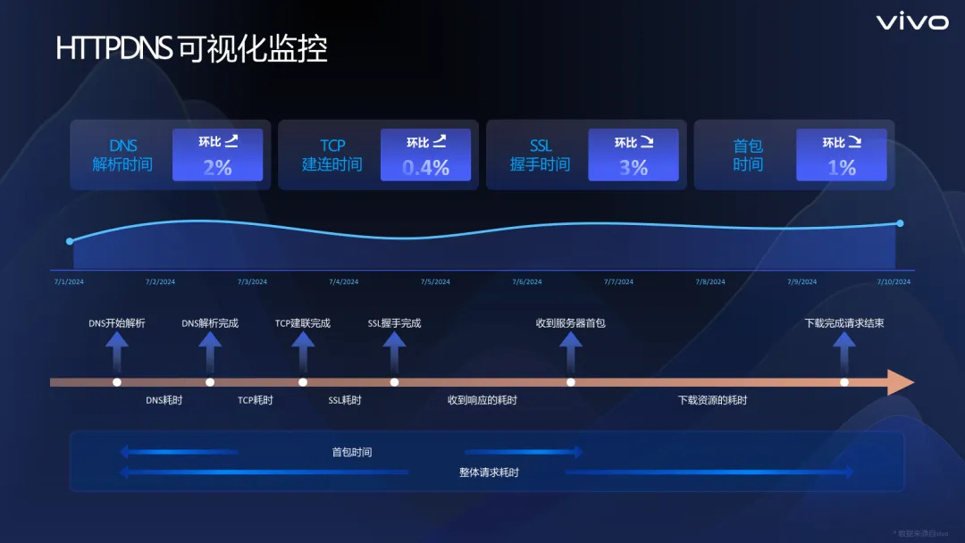 vivo HTTPDNS 平台提供全链路的可视化监控能力;能够监控用户从 DNS 解析到整个请求全部结束的所有阶段的耗时与请求;根据监控可以高效定位网络请求的各个阶段的异常;同时也提供省份运营商维度的区域性监控和异常预警的能力;解决了业务访问链路无监控的难点。根据省份运营商维度的区域性监控,可以针对不同地区的网络访问环境制定对应的优化方案,预警能力能够及时发现异常并及时进行优化。
