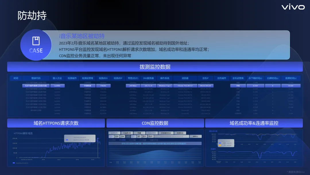在防劫持方面, 2023年2月 i音乐域名某地区被劫持,通过监控发现域名被劫持到国外地址;vivo HTTPDNS 平台监控发现域名使用 HTTPDNS 解析正常,域名成功率和连通率均正常;CDN 监控业务流量正常,未出现任何异常。