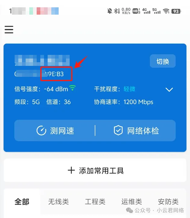 手机下一个“网络百宝箱”,打开后首页能看到当前连接的AP点即BSSID信息: