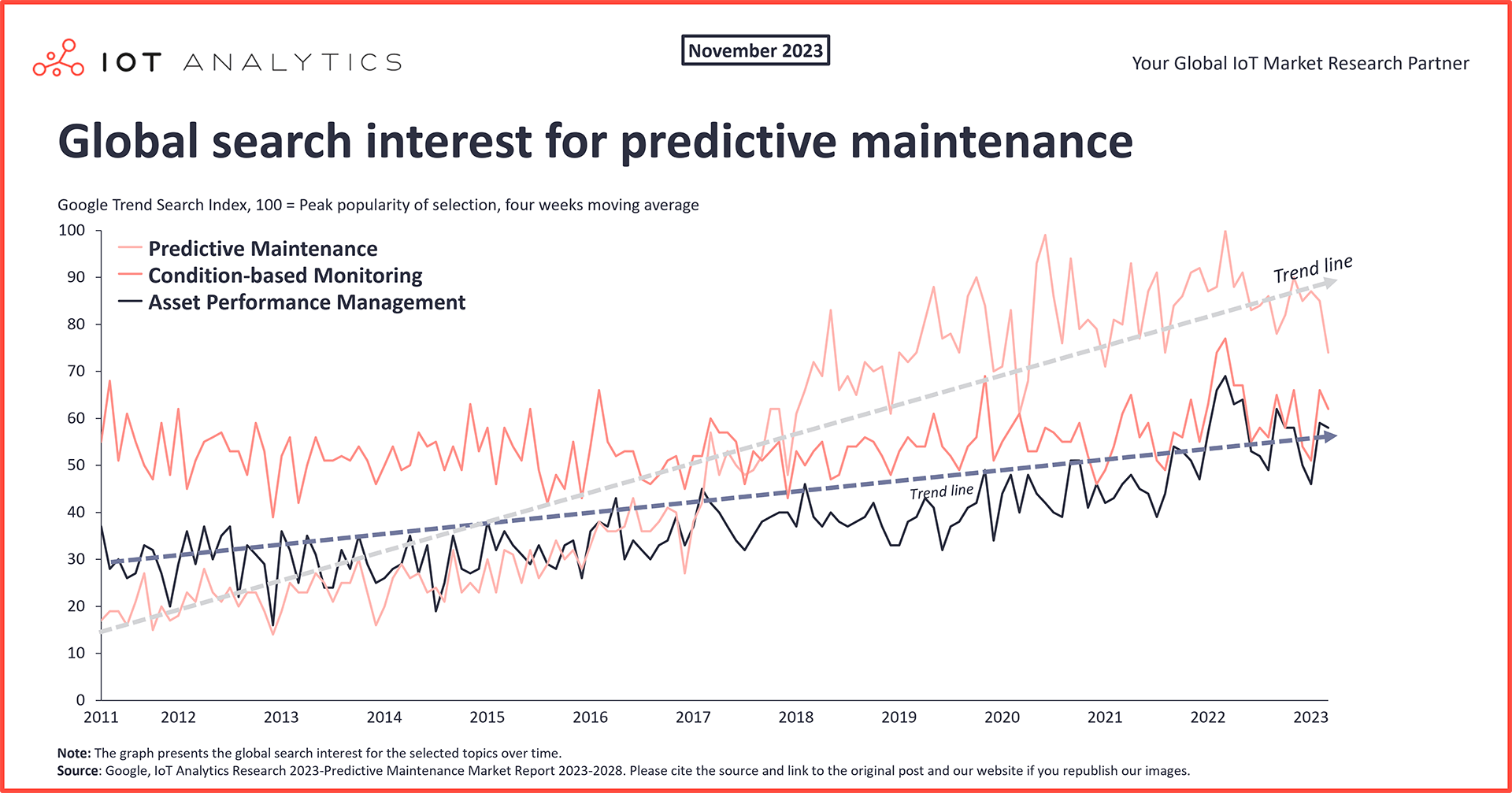 过去 12 年来,对预测性维护及相关概念的普遍搜索兴趣一直在上升。 自 2017 年我们开始报道该主题以来,该术语的在线搜索量增长了近三倍,并且已经超出了基于状态的维护和资产绩效管理 (APM) 相关搜索的范围。