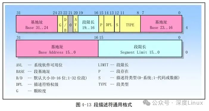 当创建描述符的时候,应该把 A 位清零。之后,每当该段被访问时,准确地说是处理器把这个段的段选择符加载进段寄存器时,CPU 就将该位置“1”;对该位的清零是由操作系统负责的,通过定期监视该位的状态,就可以统计出该段的使用频率(比如,每 1 秒钟查看一次,一旦置位就清零,统计 10 秒钟内被置位了多少次,次数越多说明使用越频繁)。当内存空间紧张时,可以把不经常使用的段退避到硬盘上,从而实现虚拟内存管理。