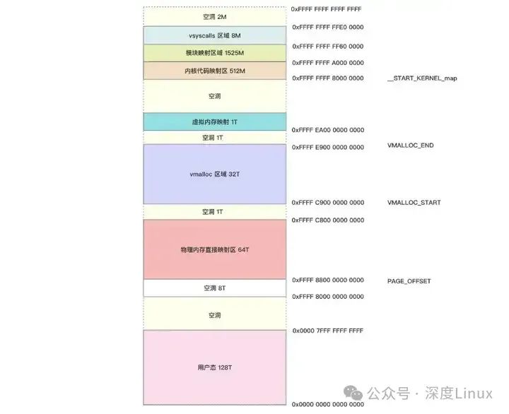其中,地址 0x0000 7FFF FFFF FFFF - 0x0000 7FFF FFFF FFFF 共128T(47位),属于用户空间;地址 0xFFFF 8000 0000 0000 - 0xFFFF FFFF FFFF FFFF 共128T(47位), 属于内核空间。示意图如下: