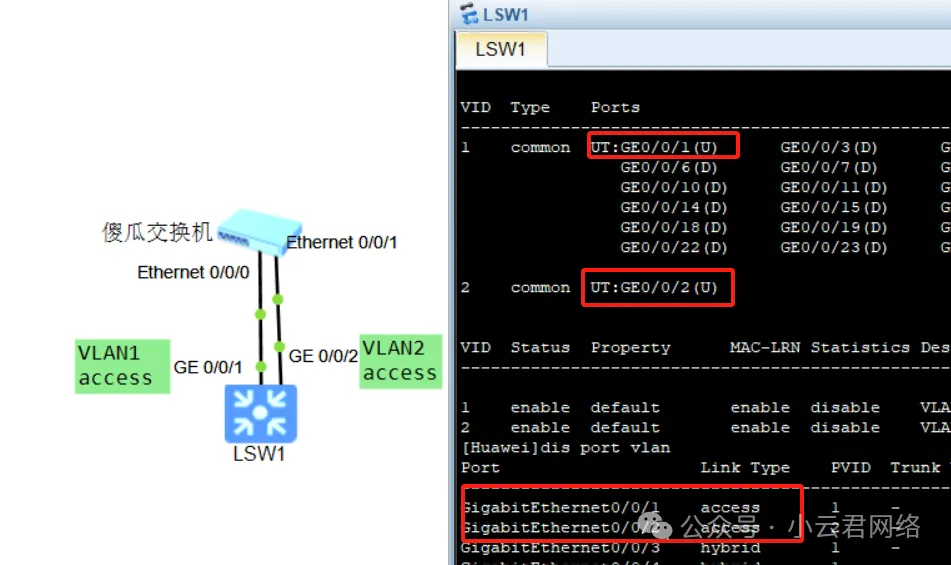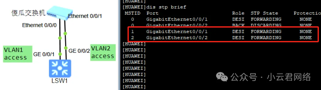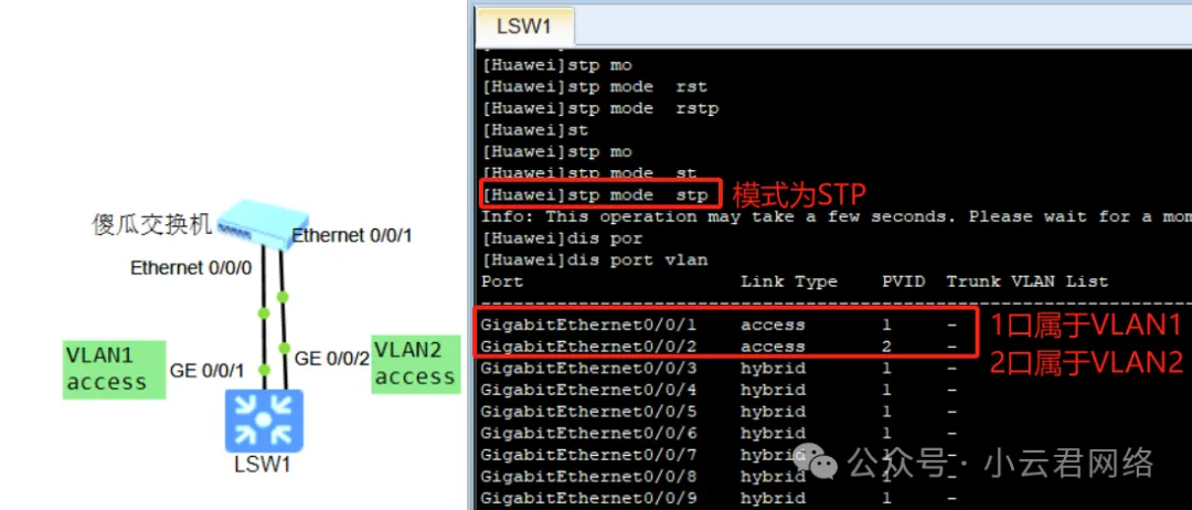搭建拓扑本例通过eNSP搭建拓扑进行模拟,交换机使能STP模式,1口配置为Access VLAN1,2口配置为Access VLAN2。