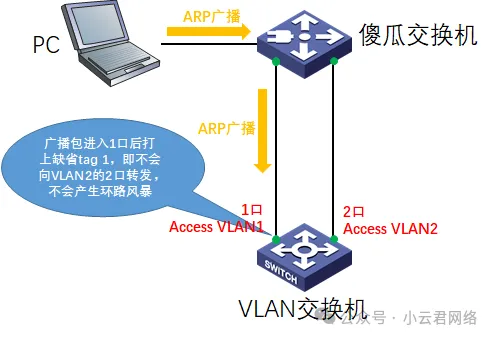 这个拓扑中,SW1的G0/0/1和G0/0/2分别属于不同的VLAN1和VLAN2,两个口同时接傻瓜交换机,相当于“物理自环”了,但其实逻辑上并未环路,这种自环网络是不会产生广播风暴的,如下图: