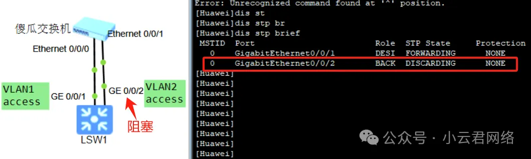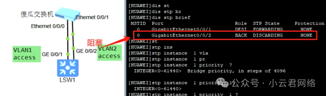 可以看到最终是2口被阻塞了,STP优先级比较是“小优”,1口优先级更高阻塞2口符合预期。